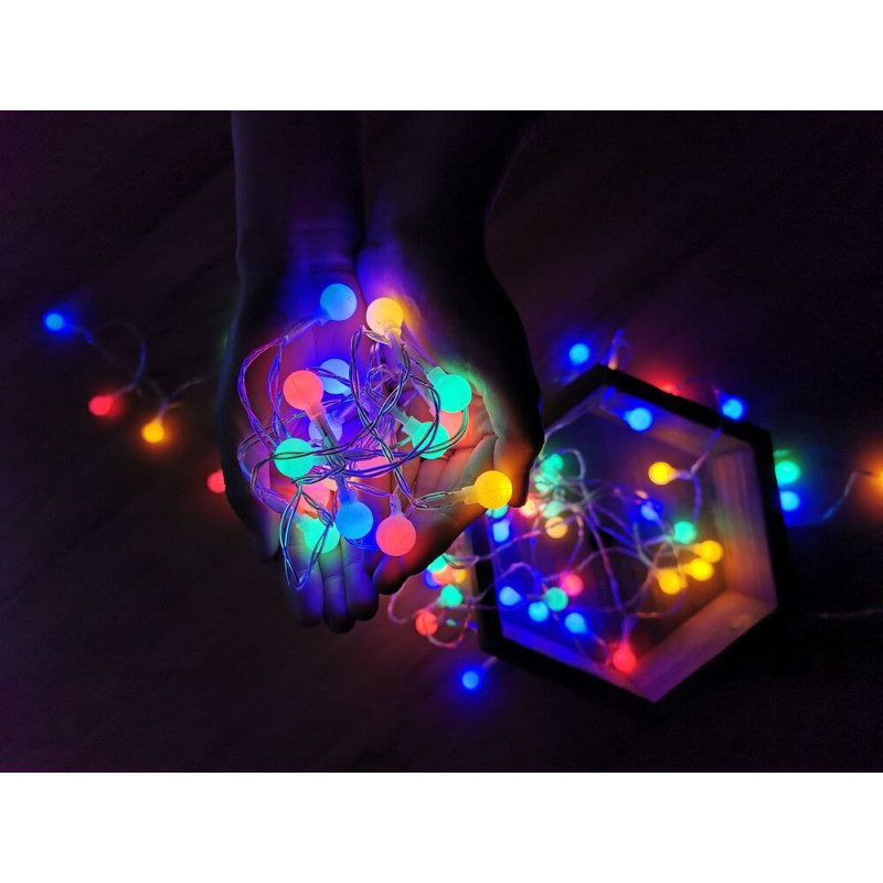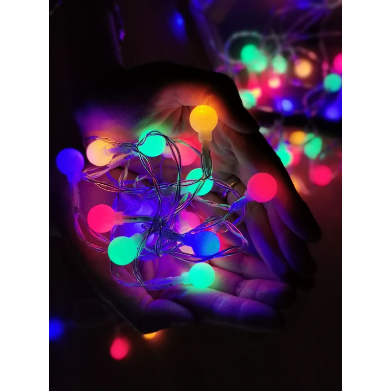 Svētku noskaņojumu Ziemassvētku daudzkrāsu lampiņu virtene.